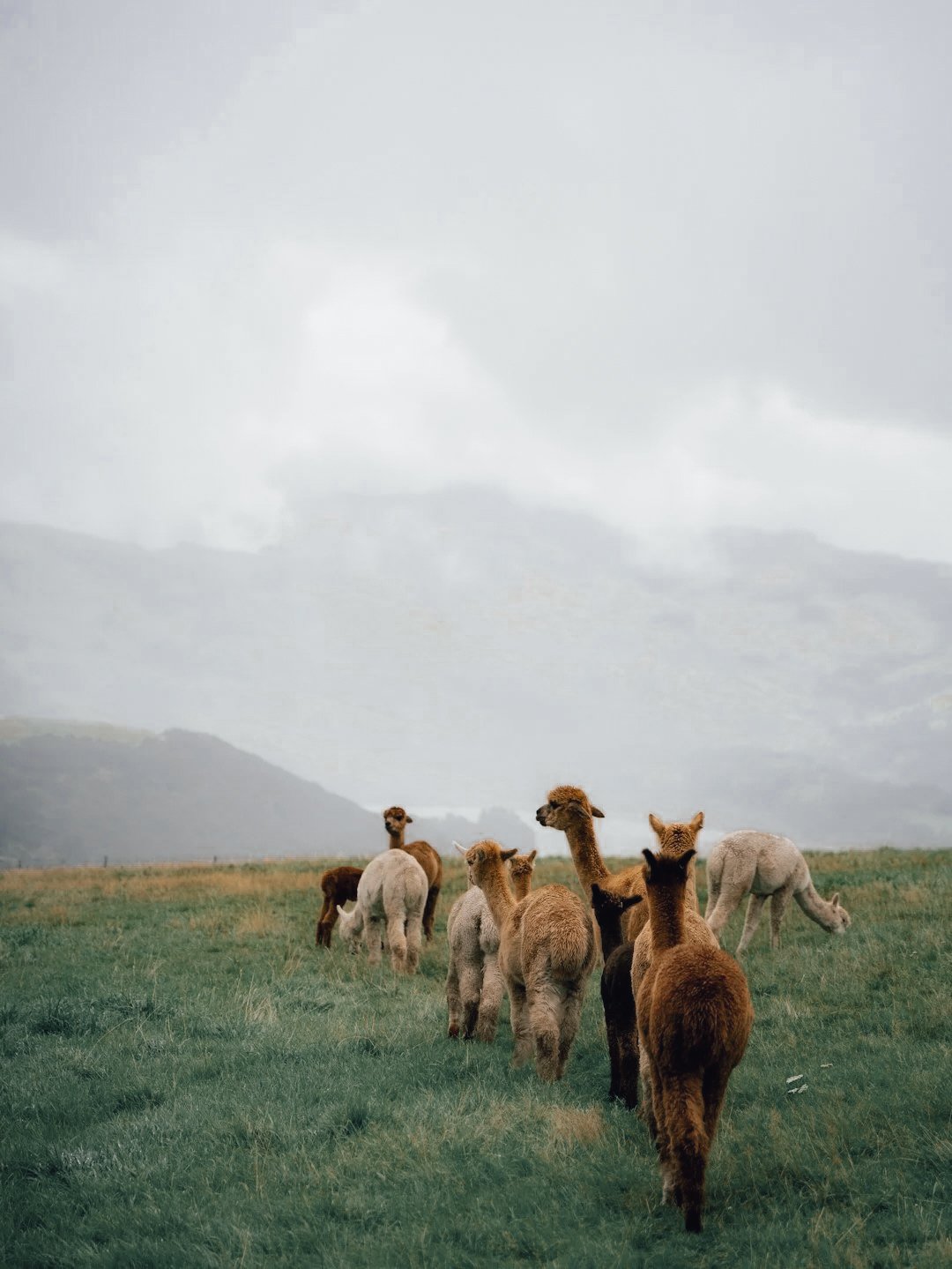 The alpacas roam freely on vast lands in the Andean Mountains, grazing naturally across open landscapes. They live in harmony with the ecosystem and have one of the lightest environmental footprints of any herd animal. Their padded feet do not damage soil and they nibble grass without uprooting it, allowing the earth to easily regenerate. This makes alpaca wool one of the most sustainable fibres in the world.